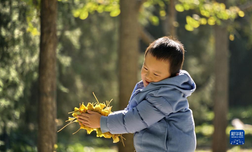 11月11日,一名小朋友在天壇公園林間玩耍。