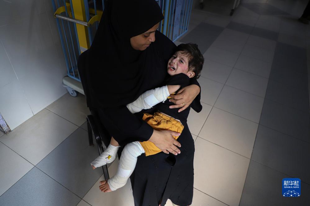 11月9日,在加沙地帶南部城市汗尤尼斯一處醫(yī)院,一名女子懷抱一名受傷的兒童。