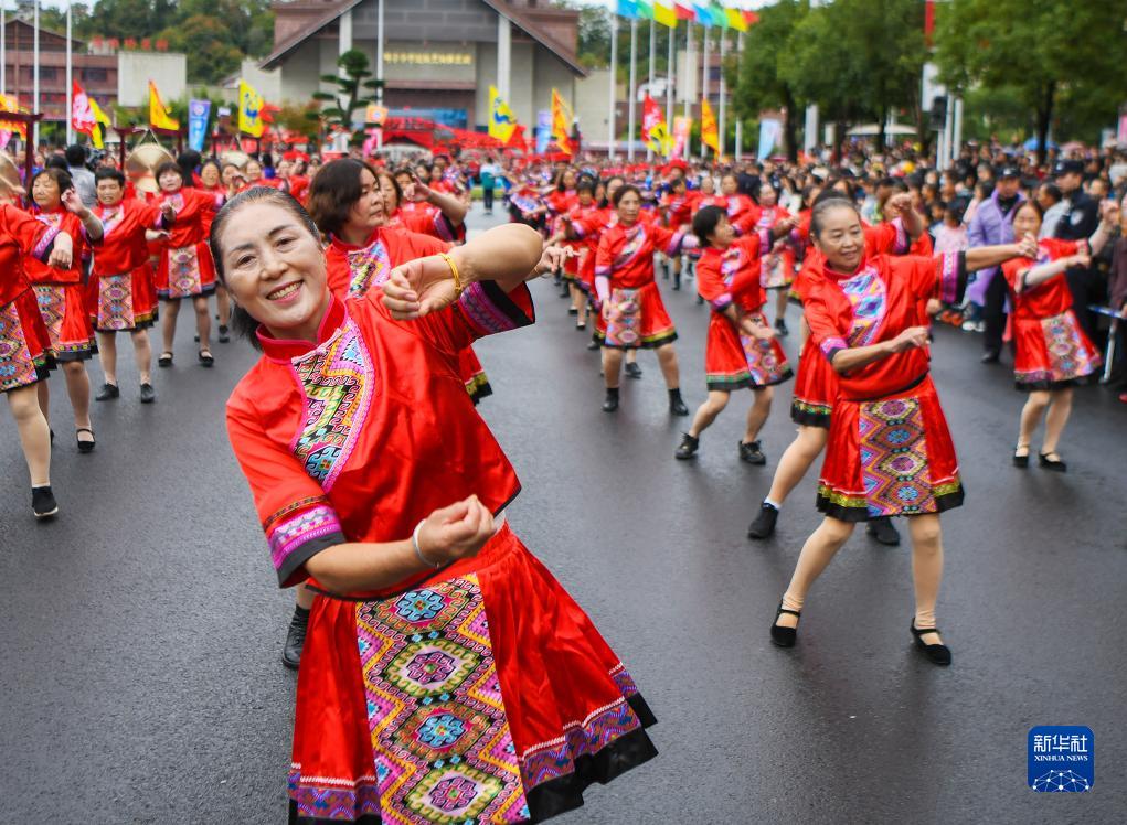 當(dāng)日,湖北省恩施土家族苗族自治州來(lái)鳳縣舉辦第三屆土家擺手舞文化節(jié),吸引來(lái)自貴州、湖南、湖北、重慶等省市的千余名擺手舞愛(ài)好者參加展演、巡游等活動(dòng),向市民和游客展示土家非遺擺手舞的獨(dú)特魅力。