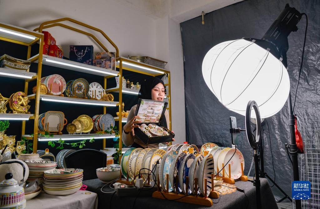 11月10日,在印度尼西亞雅加達,“美麗珍珠商店”員工在“雙十一”購物節期間直播帶貨。