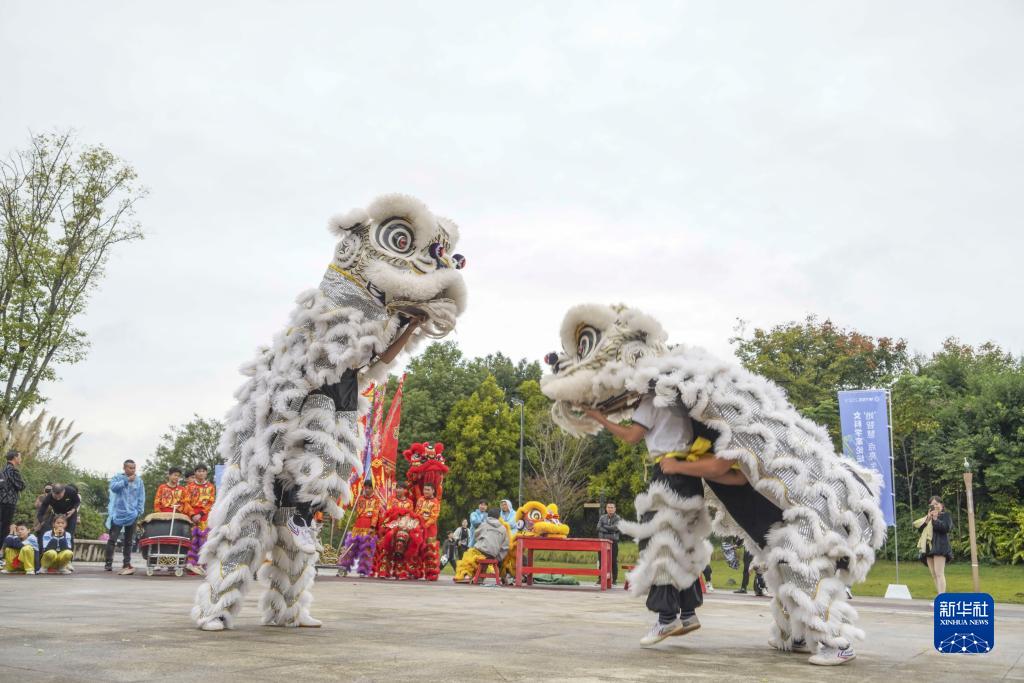 11月11日,在浙江省溫州市三垟濕地公園北廣場,舞獅隊選手在比賽中。