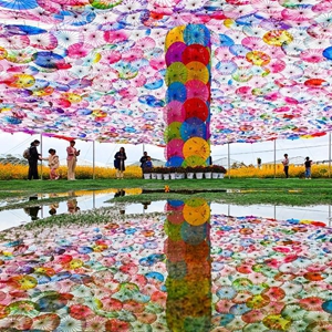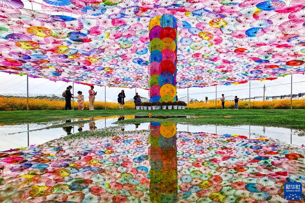 11月11日,游客在寧波市寧海縣力洋鎮(zhèn)海頭村的傘棚下游玩賞花。