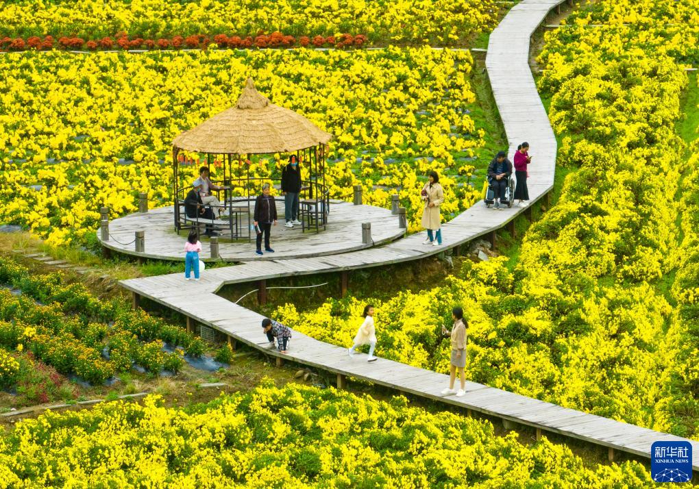 11月11日拍攝的在寧波市寧海縣力洋鎮海頭村的菊花園中游玩賞花的游客(無人機照片)。