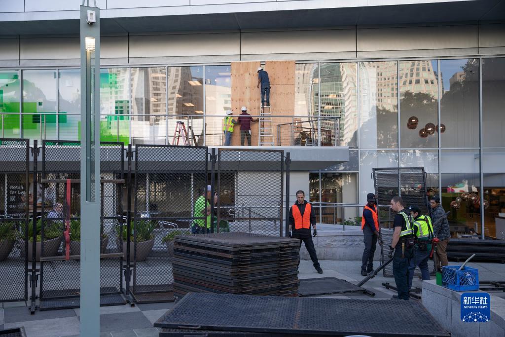 11月10日,工作人員在美國舊金山亞太經(jīng)合組織會議場地外安裝金屬圍欄。