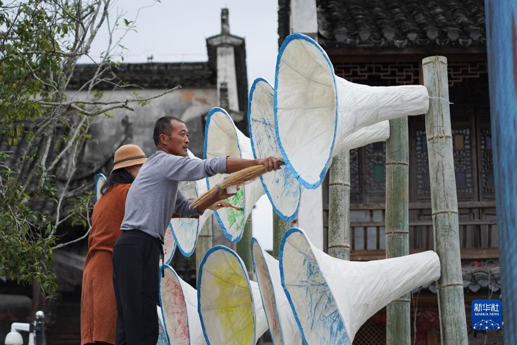11月11日,人們在葉氏支祠外的廣場上繪制喇叭狀的紙工藝品,作為展覽開幕式的布景。