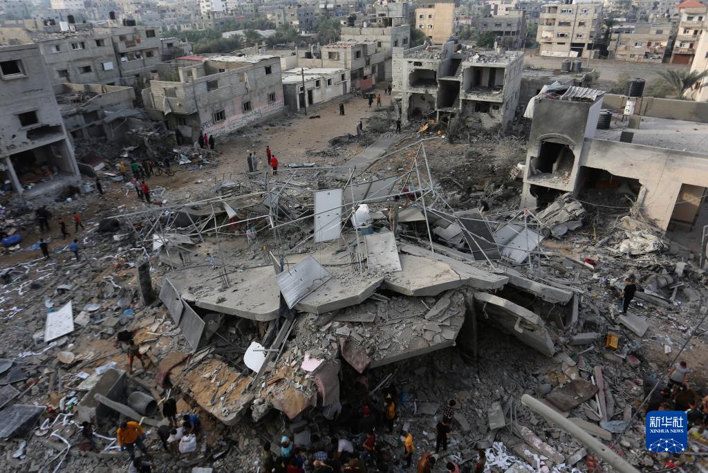 11月11日,在加沙地帶南部城市拉法,人們查看遭以色列襲擊后的建筑。