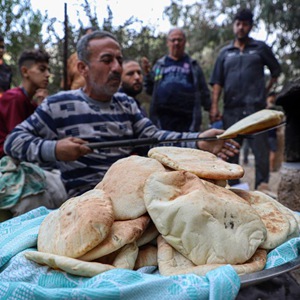 11月11日,在加沙地帶南部城市汗尤尼斯,志愿者為無家可歸的巴勒斯坦人制作大餅。