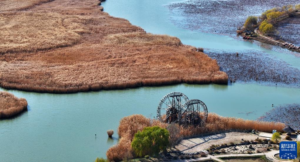 立冬節(jié)氣過后,位于寧夏銀川市興慶區(qū)的鳴翠湖國家濕地公園,金黃色的蘆葦隨風(fēng)飄蕩,各色林木五彩斑斕,構(gòu)成獨(dú)特的初冬濕地景觀。