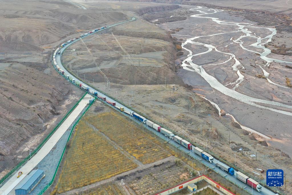 入境車輛有序進入新疆伊爾克什坦口岸(11月7日攝,無人機照片)。