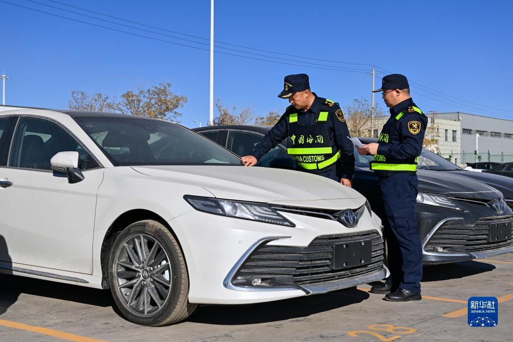 在新疆喀什綜合保稅區(qū)內(nèi)的海關(guān)施封集中查驗作業(yè)區(qū),海關(guān)關(guān)員在查驗出口商品車(11月4日攝)。