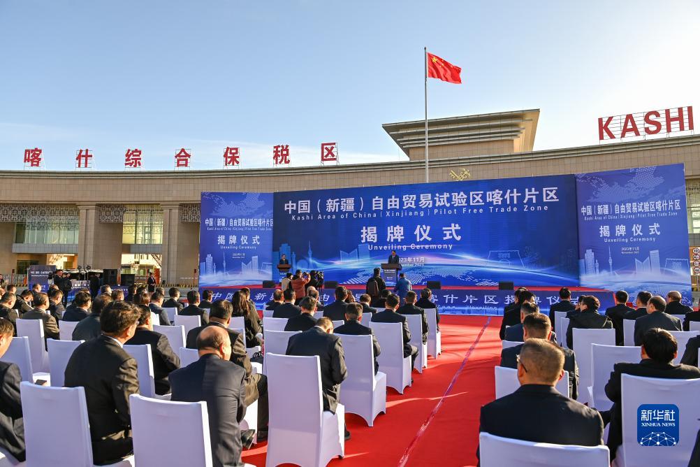 這是11月11日拍攝的中國(新疆)自由貿(mào)易試驗區(qū)喀什片區(qū)揭牌儀式現(xiàn)場。