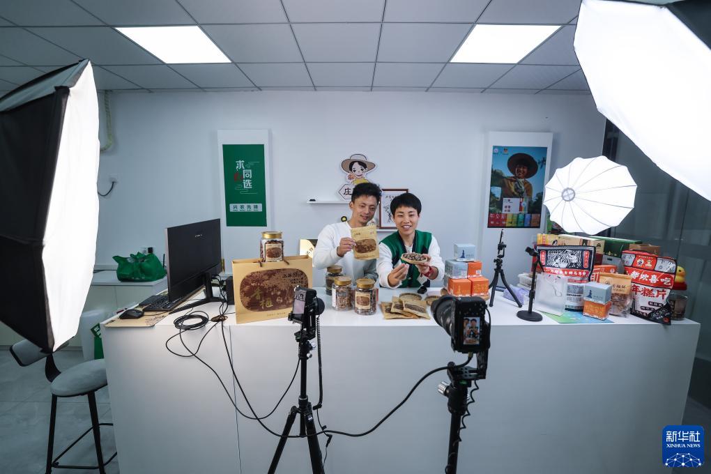 11月12日,浙江省諸暨市東白湖鎮(zhèn)上英村黨總支書記趙堅均、黨員志愿者莊園(右)在“上英園夢”共富工坊直播間銷售香榧。