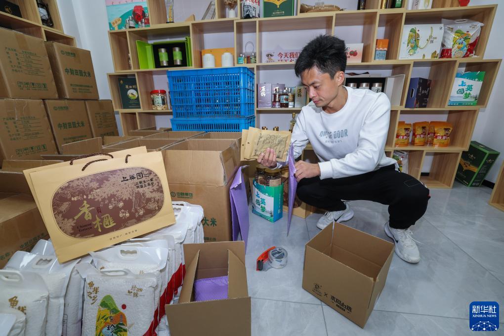 11月12日,浙江省諸暨市東白湖鎮(zhèn)上英村黨總支書記趙堅均在直播間打包香榧產(chǎn)品準(zhǔn)備發(fā)貨。