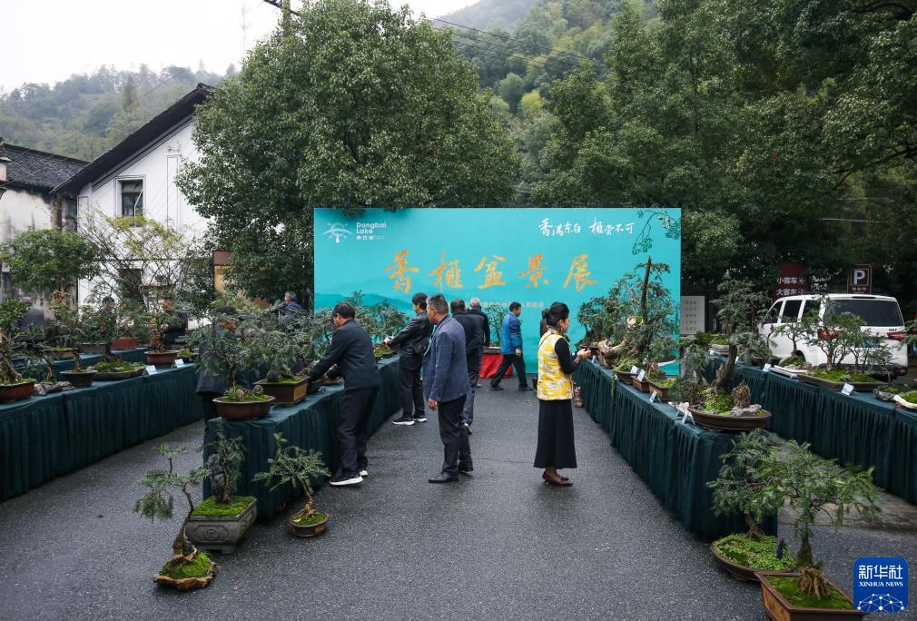 11月11日,在浙江省諸暨市東白湖鎮,香榧盆景愛好者、游客參觀香榧盆景展。