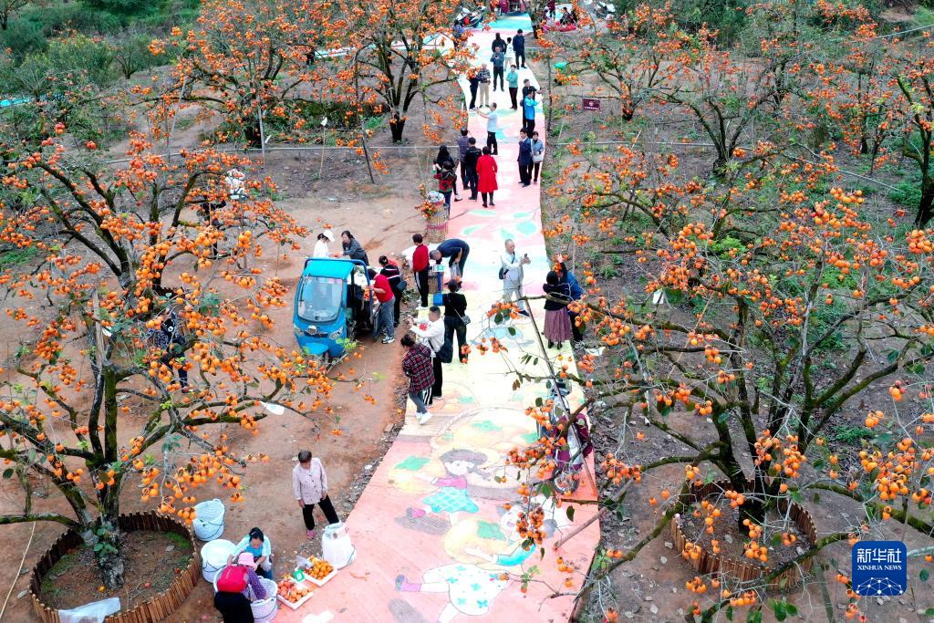 初冬時節,福建省寧德市古田縣利洋村柿子園的枝頭掛滿了橘紅的柿子,給這個小山村增添了亮麗的色彩,吸引游客前來游玩。