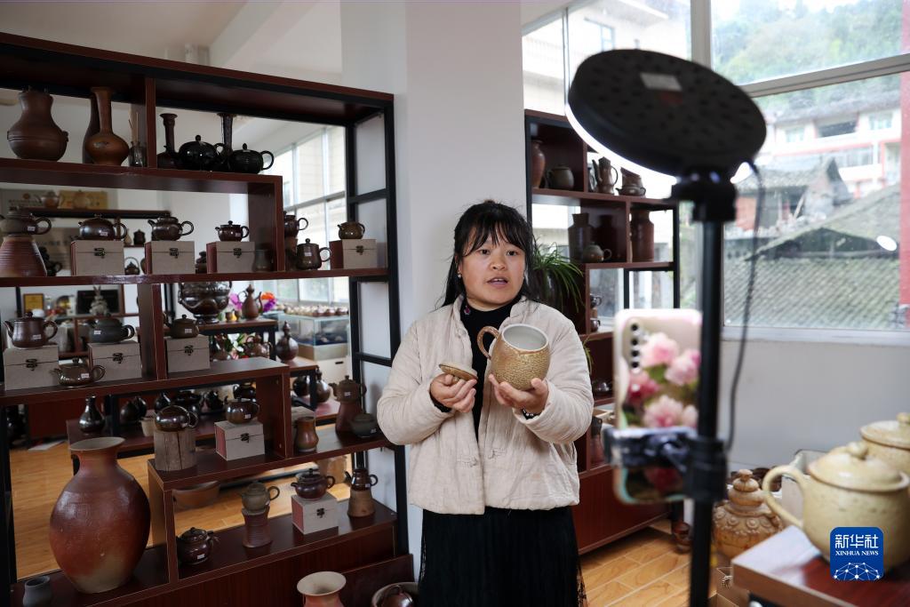 11月11日,在重慶市黔江區(qū)濯水鎮(zhèn)石雞坨土陶非遺工坊,工人直播銷(xiāo)售土陶產(chǎn)品。