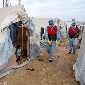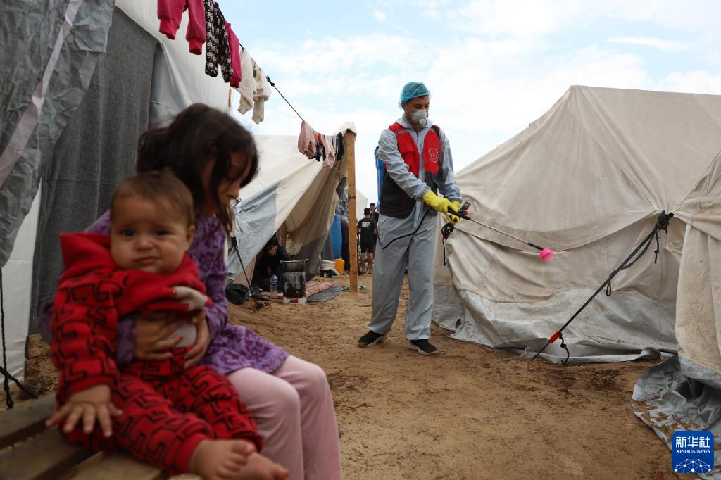 11月12日,工作人員在加沙地帶南部城市汗尤尼斯一處臨時難民營噴灑消毒液。