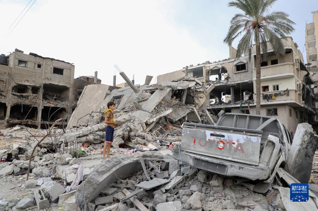 11月12日,一名兒童站在加沙地帶南部城市汗尤尼斯損毀的建筑旁。