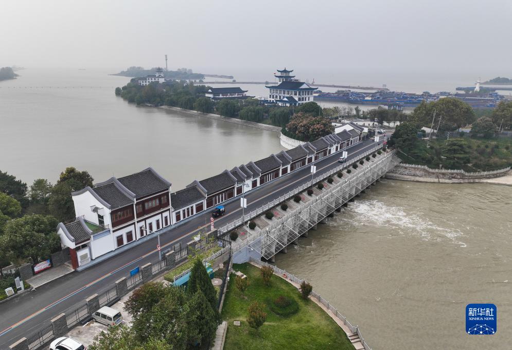 洪澤湖湖水通過高良澗閘流入蘇北灌溉總渠(11月9日攝,無人機照片)。