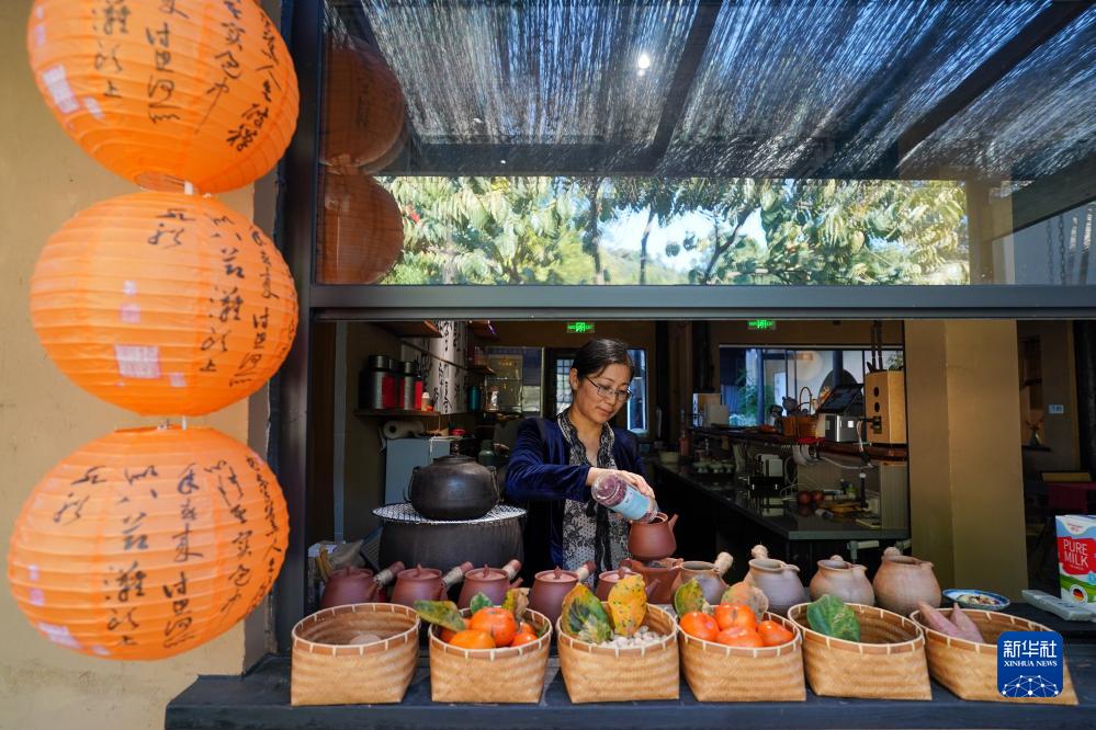 工作人員在樹山村的一家民宿內為游客制作茶飲(11月2日攝)。