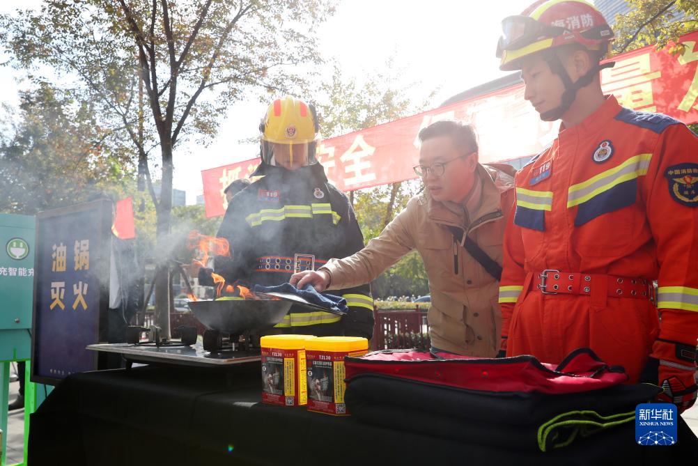 11月13日,市民(中)在消防員指導下進行廚房油鍋滅火體驗。
