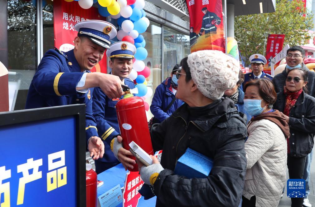 11月13日,消防宣傳工作人員將現場展示的一支滅火器送給參觀的市民。