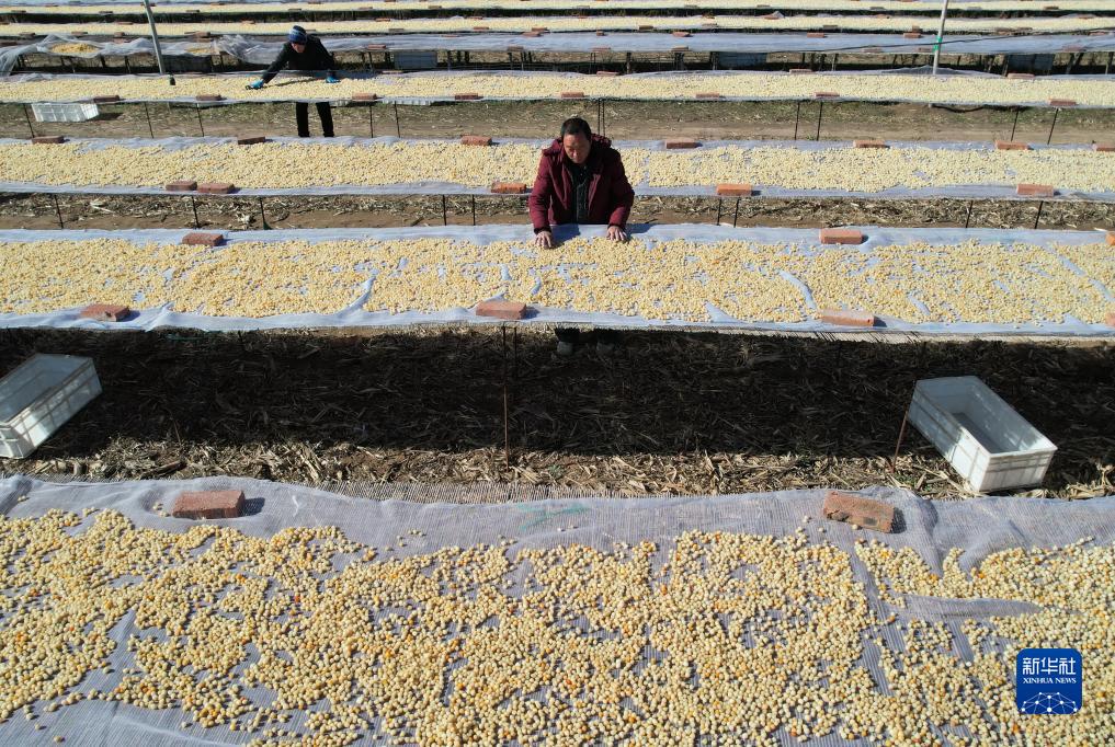 11月13日,秦皇島市昌黎縣團(tuán)林鄉(xiāng)的扇貝養(yǎng)殖戶在晾曬收獲的扇貝柱(無人機(jī)照片)。