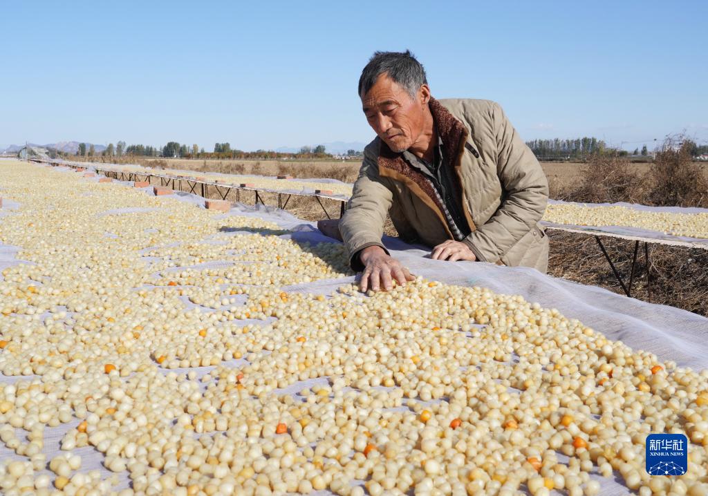 11月13日,秦皇島市昌黎縣團林鄉的扇貝養殖戶在晾曬收獲的扇貝柱。