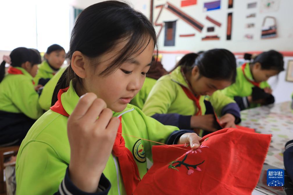 11月13日,在貴州省黔東南苗族侗族自治州施秉縣楊柳塘鎮中心小學,學生在苗繡課堂學習刺繡。