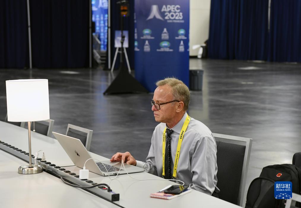11月12日,一名記者在美國舊金山的2023年亞太經合組織會議國際媒體中心內工作。