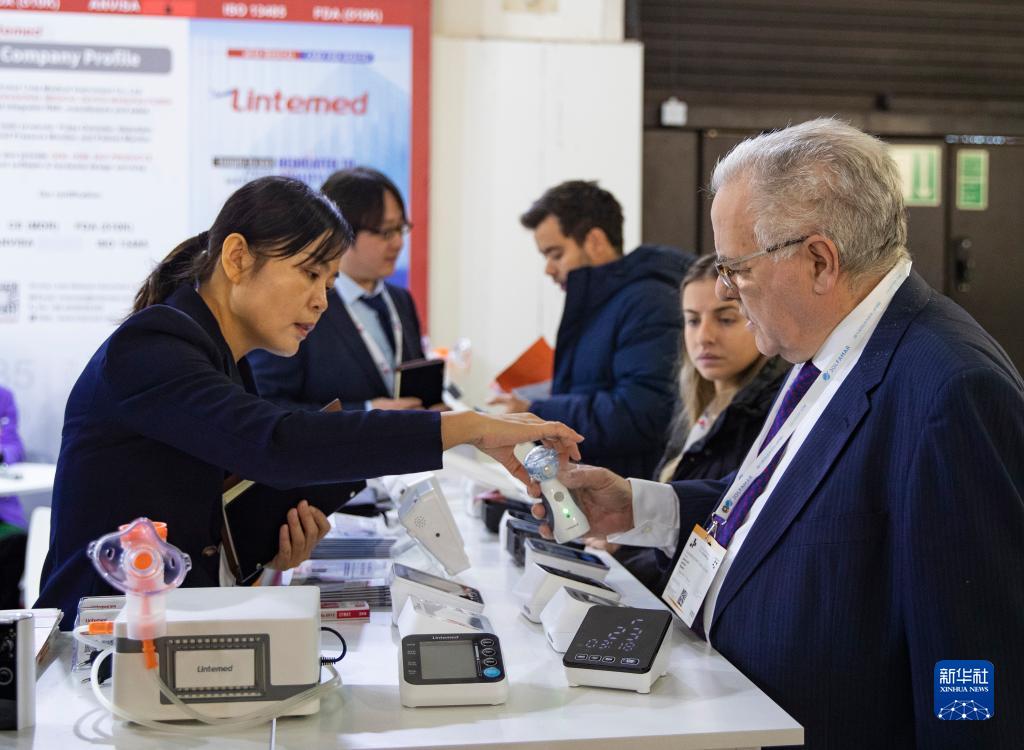 11月13日,在德國(guó)杜塞爾多夫國(guó)際醫(yī)療器械設(shè)備展,參觀者在凌特公司展位咨詢洽談。新華社記者 張帆 攝