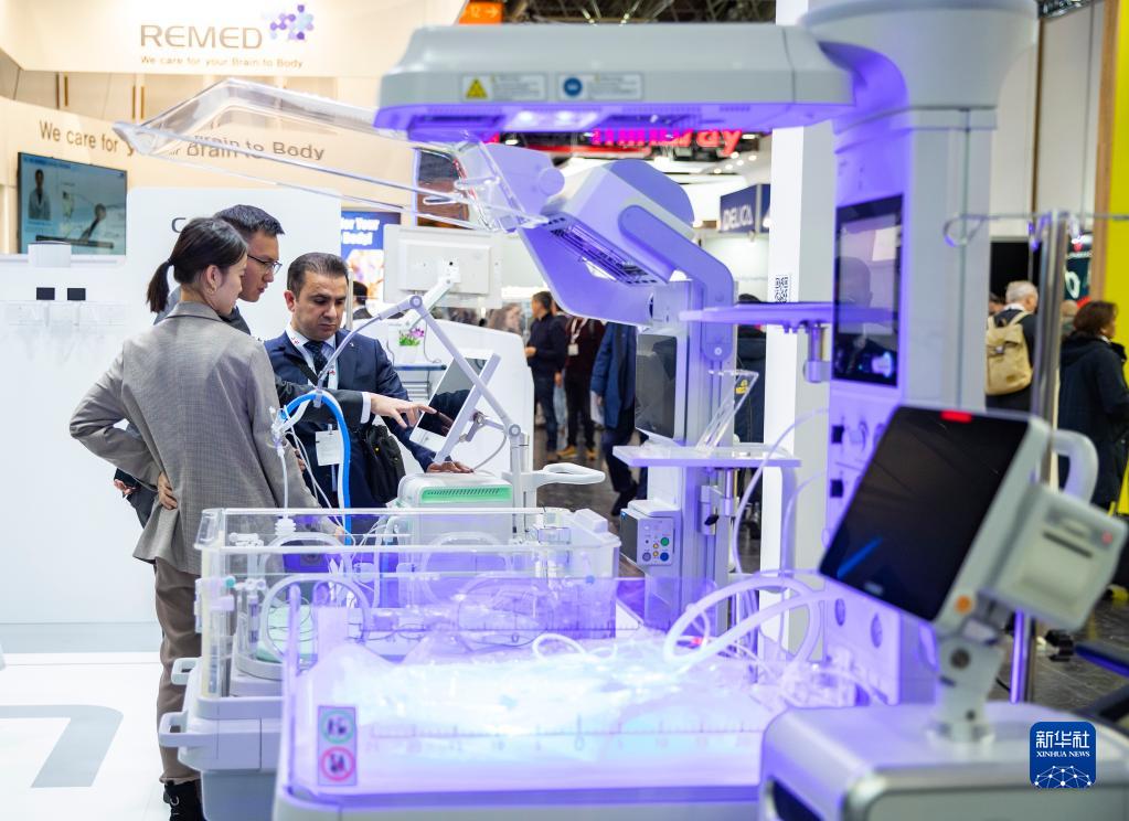 11月13日,在德國杜塞爾多夫國際醫療器械設備展,參觀者在科曼醫療展位咨詢洽談。新華社記者 張帆 攝