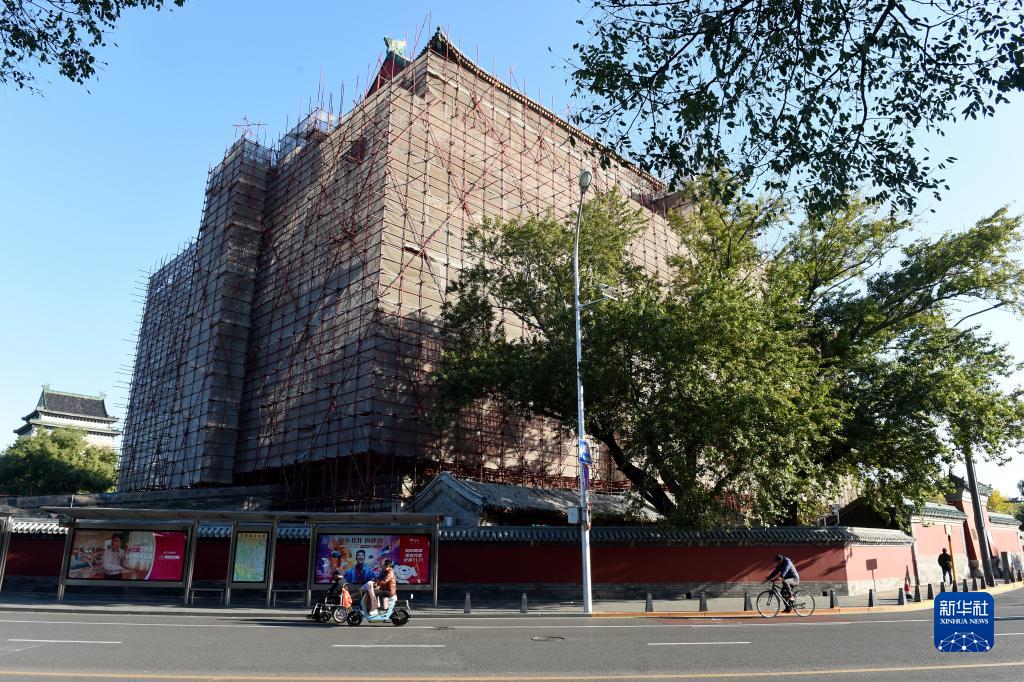北京鐘樓(左)和修繕中的北京鼓樓(11月7日攝)。鐘鼓樓位于北京中軸線的最北端,兩樓前后縱置,氣勢雄偉。作為元、明、清三代都城的報(bào)時(shí)中心,至今已有700多年的歷史。