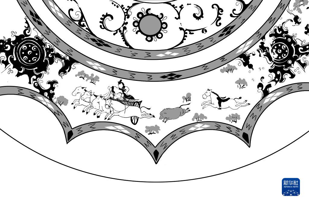 西漢彩繪人物車馬鏡局部“出行”圖案線稿圖 。新華社發 李賀 繪制