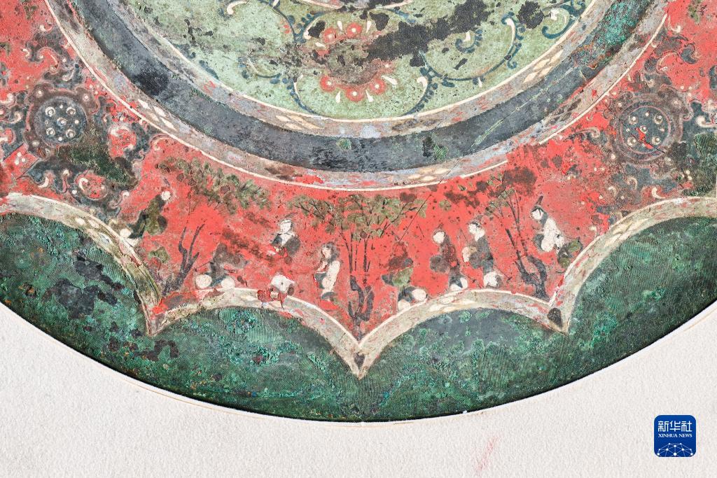 西漢彩繪人物車馬鏡局部彩繪圖案“謁見”(8月25日攝)。新華社記者 李賀 攝