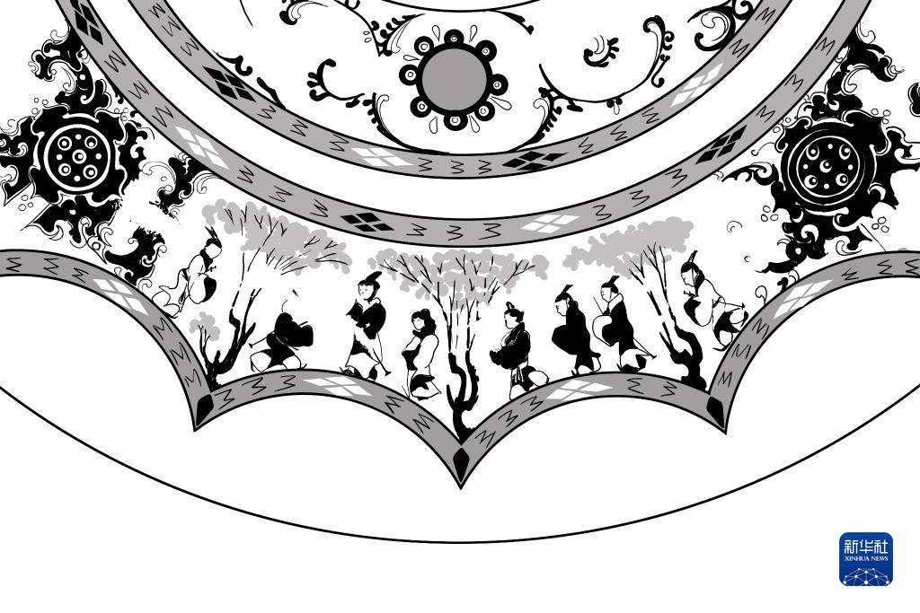 西漢彩繪人物車馬鏡局部“謁見”圖案線稿圖 。新華社發 李賀 繪制