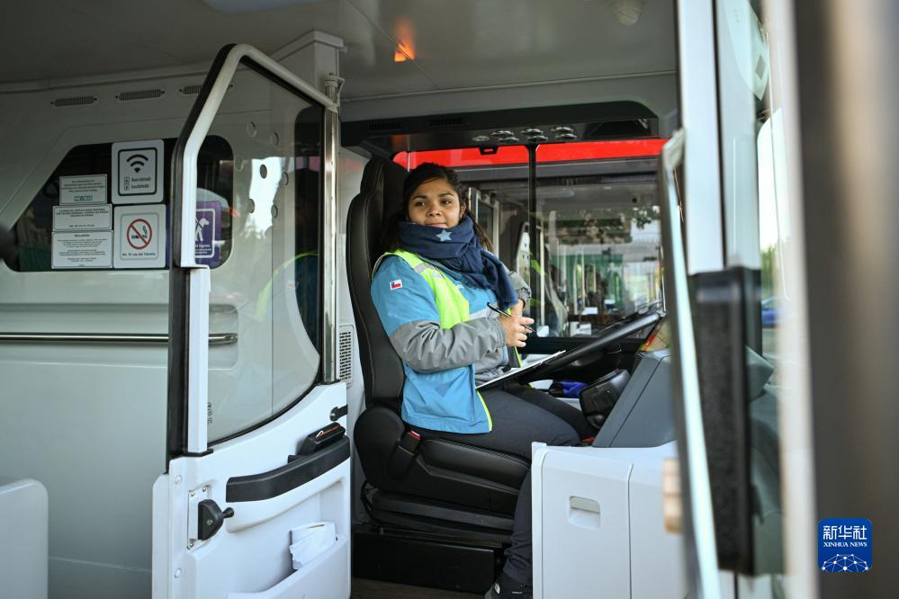 11月2日,在智利首都圣地亞哥,520路新能源公交車司機寶拉準備發(fā)車。