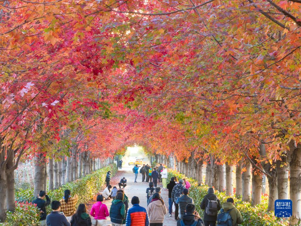 11月24日,游客在江蘇省蘇州市工業(yè)園區(qū)一處農(nóng)業(yè)園的紅楓大道賞楓(無(wú)人機(jī)照片)。