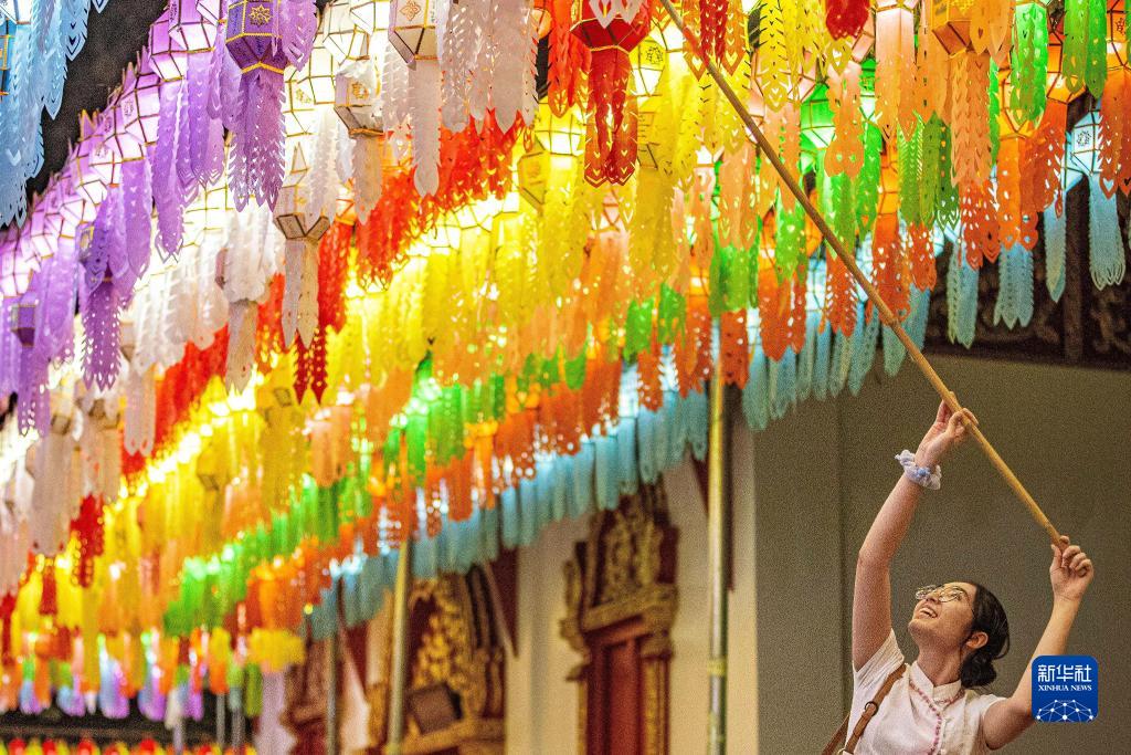11月23日,游客在泰國(guó)南奔府哈利奔猜寺懸掛燈籠。