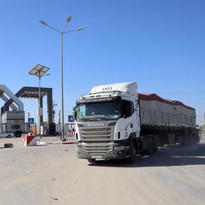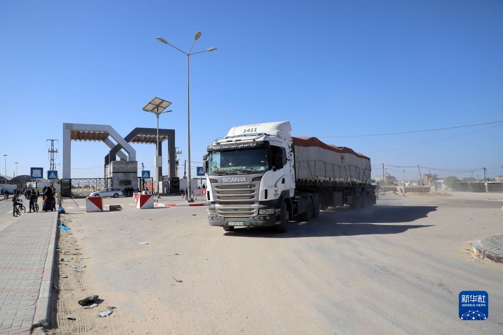11月24日,運送救援物資的卡車進入拉法口岸加沙一側。