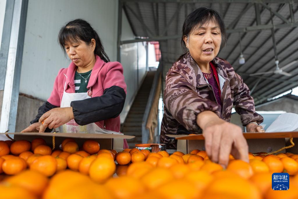 11月24日,在重慶市開州區竹溪鎮大海村的一個柑橘種植基地,村民在將采摘的砂糖橘裝盒。