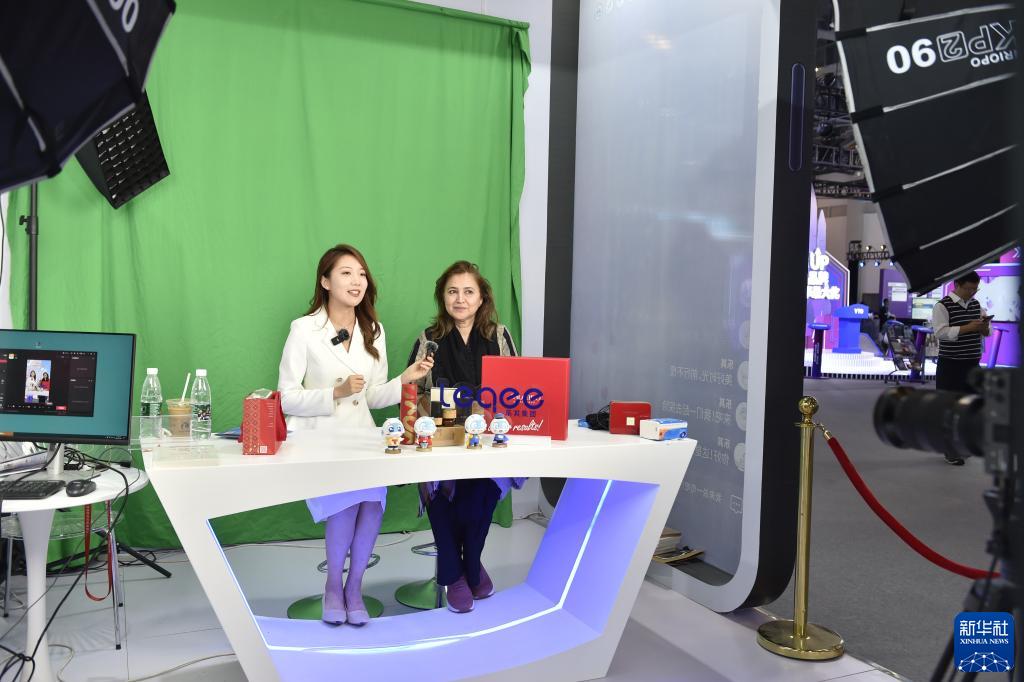 在第二屆全球數字貿易博覽會絲路電商館,外賓在“絲路電商日”活動中體驗電商直播(11月24日攝)。