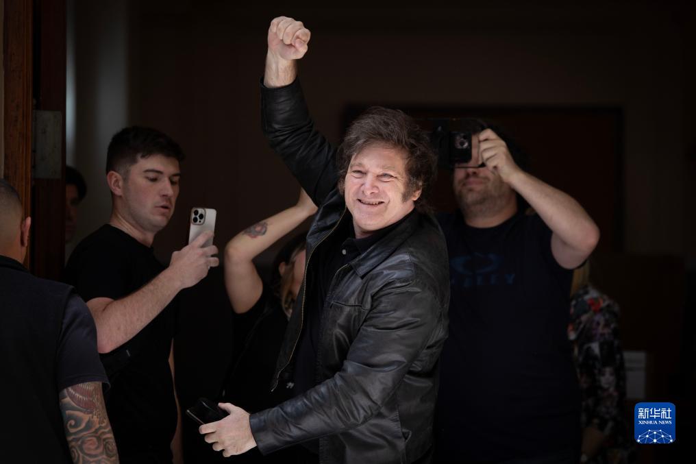 11月19日,阿根廷極右翼選舉聯盟“自由前進黨”候選人米萊在阿根廷首都布宜諾斯艾利斯的一處投票站向民眾致意。
