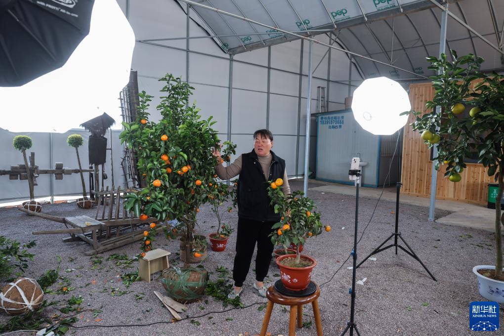 11月25日,在金華市金東區澧浦鎮前余村的“云上果園”果苗直播基地內,種植戶施曉君在直播銷售果樹。