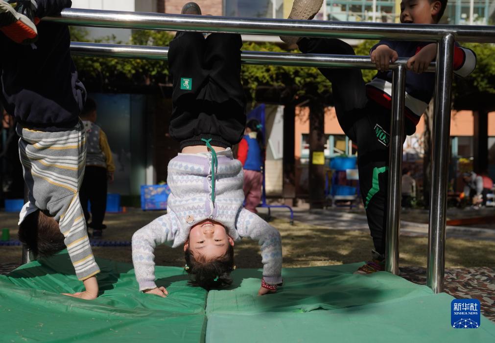11月24日,在上海市實驗幼兒園,小朋友玩雙杠。
