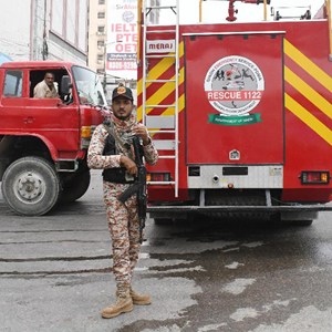 11月25日,在巴基斯坦卡拉奇,人們聚集在發生火災的商場外。