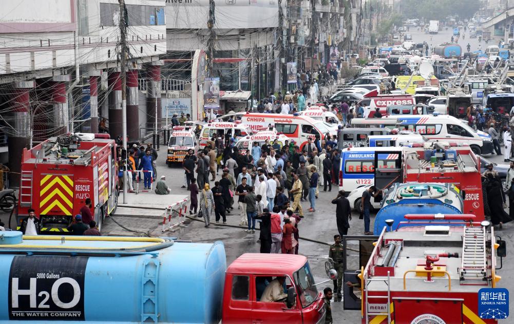 11月25日,在巴基斯坦卡拉奇,應急車輛停在發生火災的商場外。