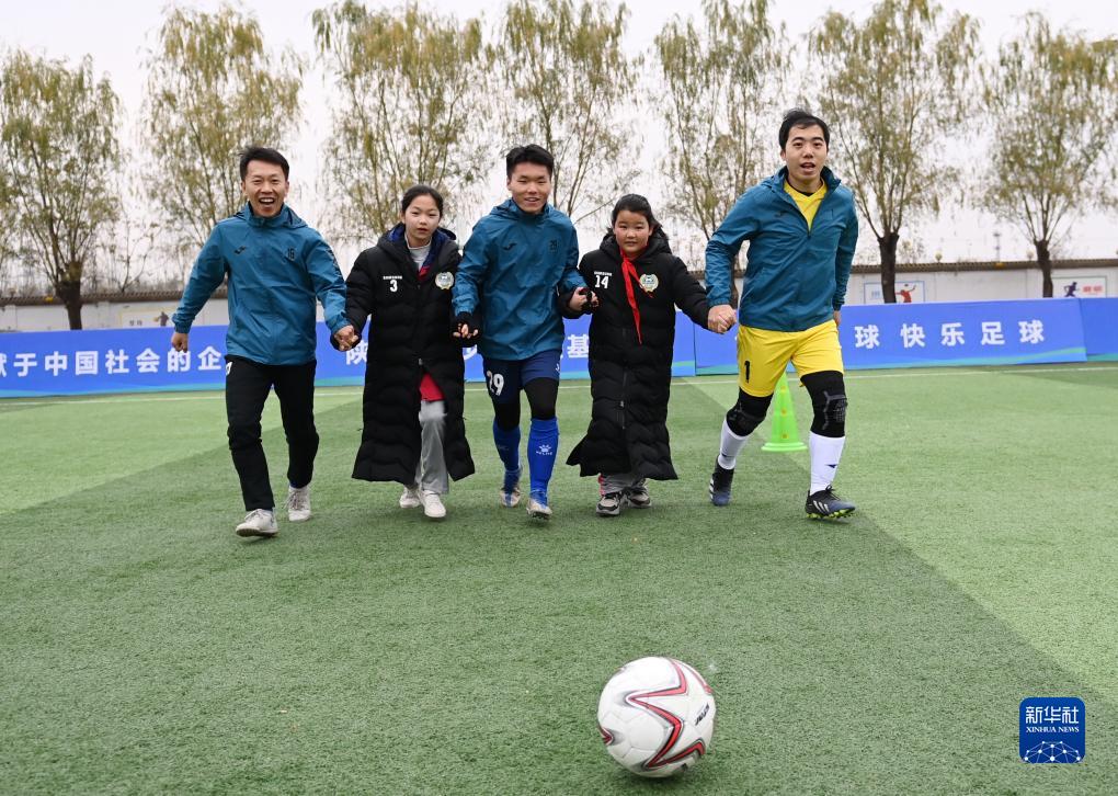 11月25日,受助學生和三星足球隊球員在鄉(xiāng)村學校公益足球課堂啟動儀式上參與趣味足球活動。