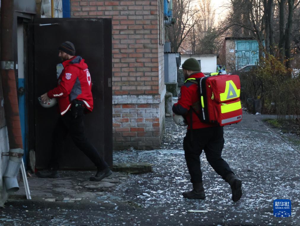 11月25日,烏克蘭紅十字會救援人員在基輔市一棟遭空襲的居民樓實施清理和救助工作。