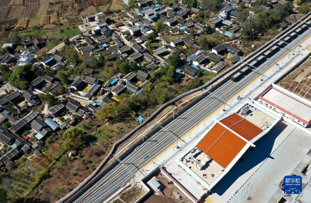 11月25日拍攝的麗香鐵路拉市海站,鐵路旁是麗江納西族民居(無(wú)人機(jī)照片)。